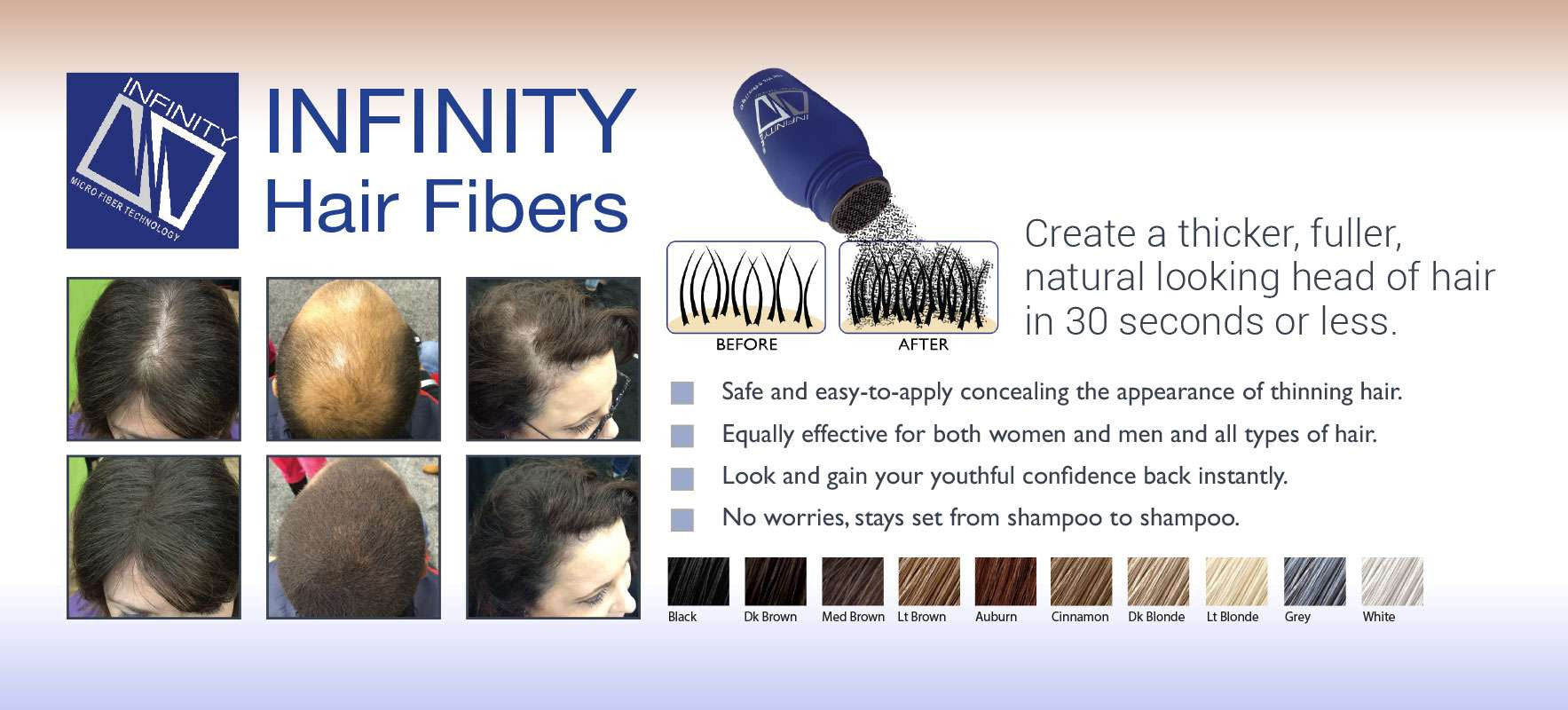 Infinity Hair Building Fibers completely eliminate the appearance of thinning hair for both Women and Men. The Hair Fibers only needs to be applied once daily and will last through wind, rain and sweat. It is totally undetectable, even within inches. All you will see is thicker looking hair! Infinity Hair Loss Concealing Fibers instantly make th...