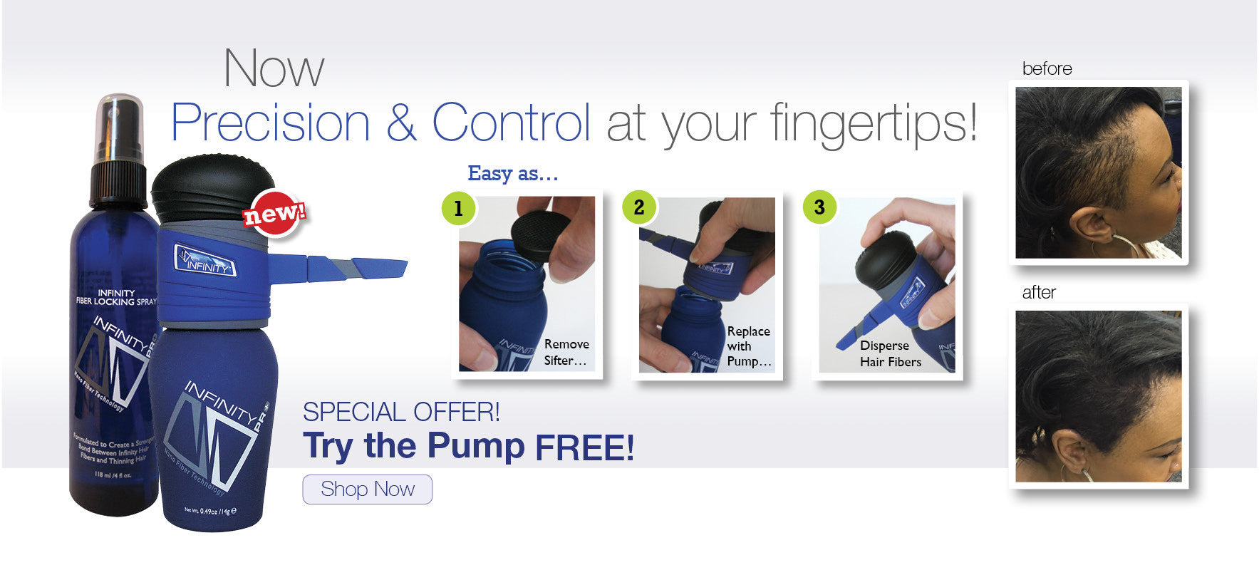 NEW Hair Fiber Spray Pump attaches to the top of the 14g, 28g and 60g Infinity bottles for easy application. For both salon professionals and home use.